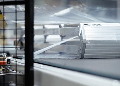 El paquete pasa por el módulo Sikker, donde se aplica un velo de film de polietileno. El cabezal de soldadura sella el film y crea una bolsa protectora que encierra el producto.
