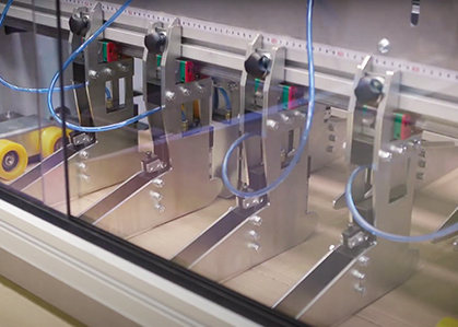 A la vez que el cartón avanza longitudinalmente, las cuchillas de hendido y de corte longitudinal, en combinación la transversal, se activan según los parámetros de caja seleccionados, para crear el troquel requerido.