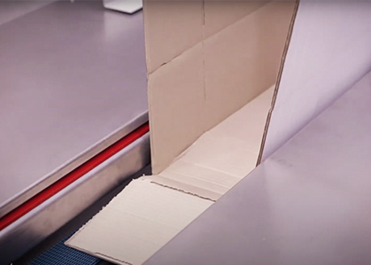 La máquina emboca el cartón y lo arrastra hasta la zona de corte y hendido. El arrastre se realiza mediante bandas motorizadas controladas por servomotores.